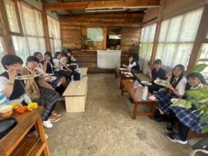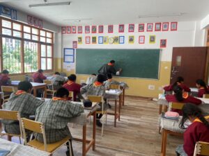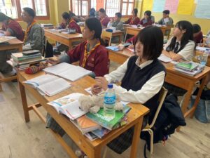 授業は白鵬・エトワール合同で各クラス2~3名ずつに分かれて参加しました。授業は英語で進行されましたが、生徒たちはこれまで培った英語力を生かし、一生懸命ノートを取りながら真剣に学んでいました。また、ブータンの公用語である「ゾンカ語」の授業にも挑戦しました。先生の説明がほとんどゾンカ語で行われるため難しさも感じましたが、生徒たちは貴重な体験として意欲的に取り組んでいました。
