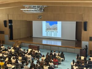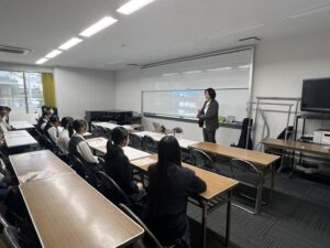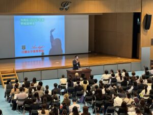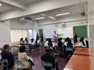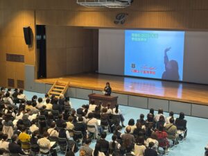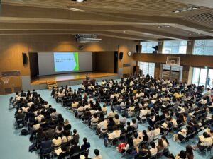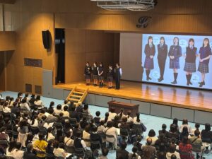 全体会では、校長挨拶、学校概要・コース説明、令和8年度入試募集要項概要説明、生徒スピーチ、制服紹介を行いました。