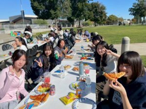 お昼は、中庭の芝生でピザをいただきました。ホストファミリーの様子や、日本からもってきたおみやげを渡したときの反応など仲間同士、話しました。午後は、スカベンジャーハントをして、現地学生や先生方と合流を深めました。