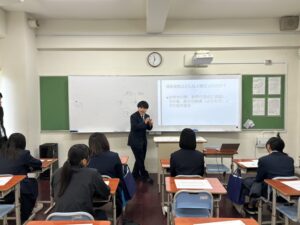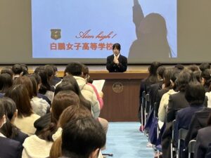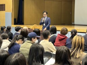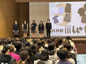 全体会では、校長挨拶、学校概要・コース説明、令和8年度入試募集要項概要説明、生徒スピーチ、制服紹介を行いました。
