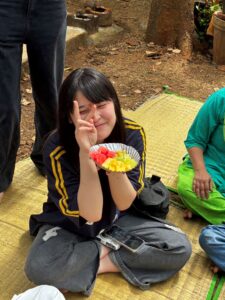 昼食は屋外にゴザを敷き、農場で採れた新鮮なフルーツや、バスマティライスを使った伝統料理をいただきました。大自然に囲まれて味わう食事は、生徒たちにとって忘れられない体験となりました。